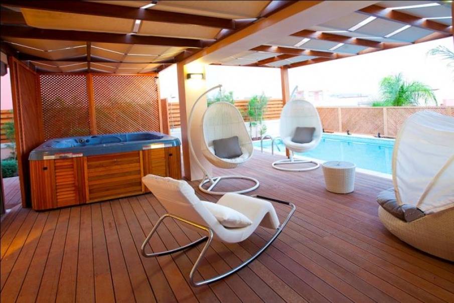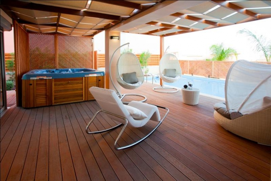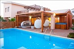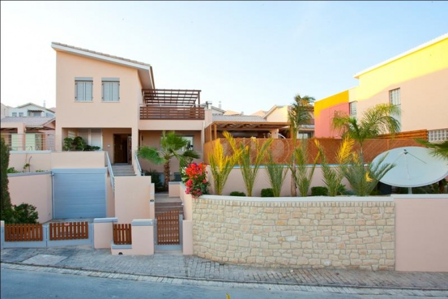 Luxury 4 bed villa, located in Amathusia Coastal Heights complex. 154 sq.m. covered area, 30 sq.m. covered verandah, 101 sq.m.- basement, 98 sq.m. uncovered verandah, total covered area 285 sq.m, plot area is 377 sq.m. Villa is additionally featured with extra expensive materials, sauna, garage and uncovered parking, private swimming pool (heated), SPA, roof garden, provision for elevator, wooden deck around pool area, pergolas with canvases, mature landscaped garden, open sea view, satellite (NTV +). It is fully furnished with all electrical appliances, security system, fireplace.