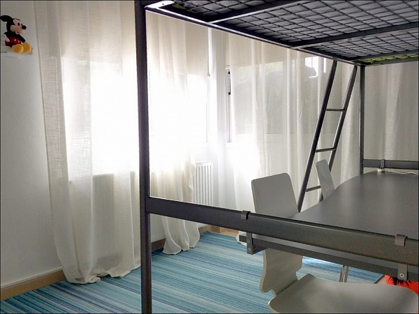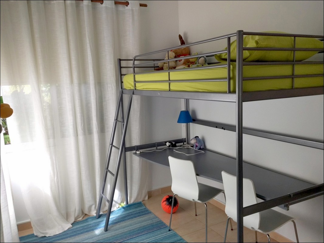 Bunk bed (on the first tier a writing desk, on the second tier a bed), a large wardrobe for clothes.