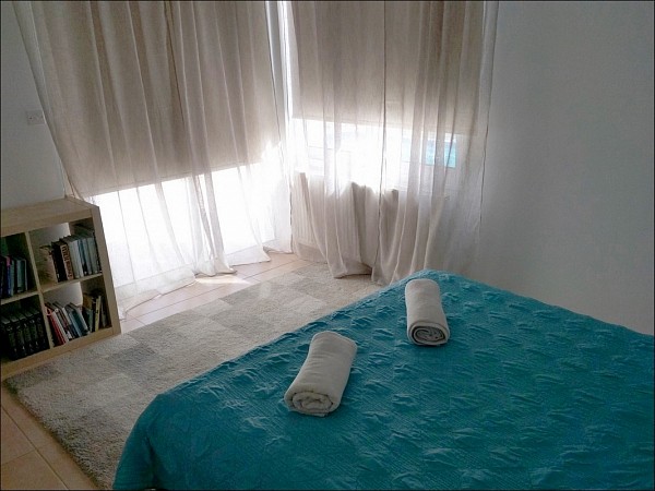 The second bedroom also has an access to the pool, a wardrobe and a double bed.