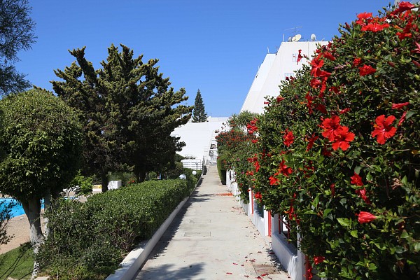 На общей, закрытой, территории комплекса Amathusia Beach Apts располагаются: бассейн, газон, зеленый сад.